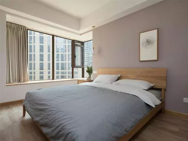 臥室給人的感覺(jué)就是舒服,溫潤(rùn)的日式木床,舒服的棉麻床品,還有金色薄紗一樣的日光,匯集成了不動(dòng)聲色的溫柔,讓人依戀。全景飄窗適合午后小憩沐浴陽(yáng)光,同樣適合晚上看城市的萬(wàn)家燈火。