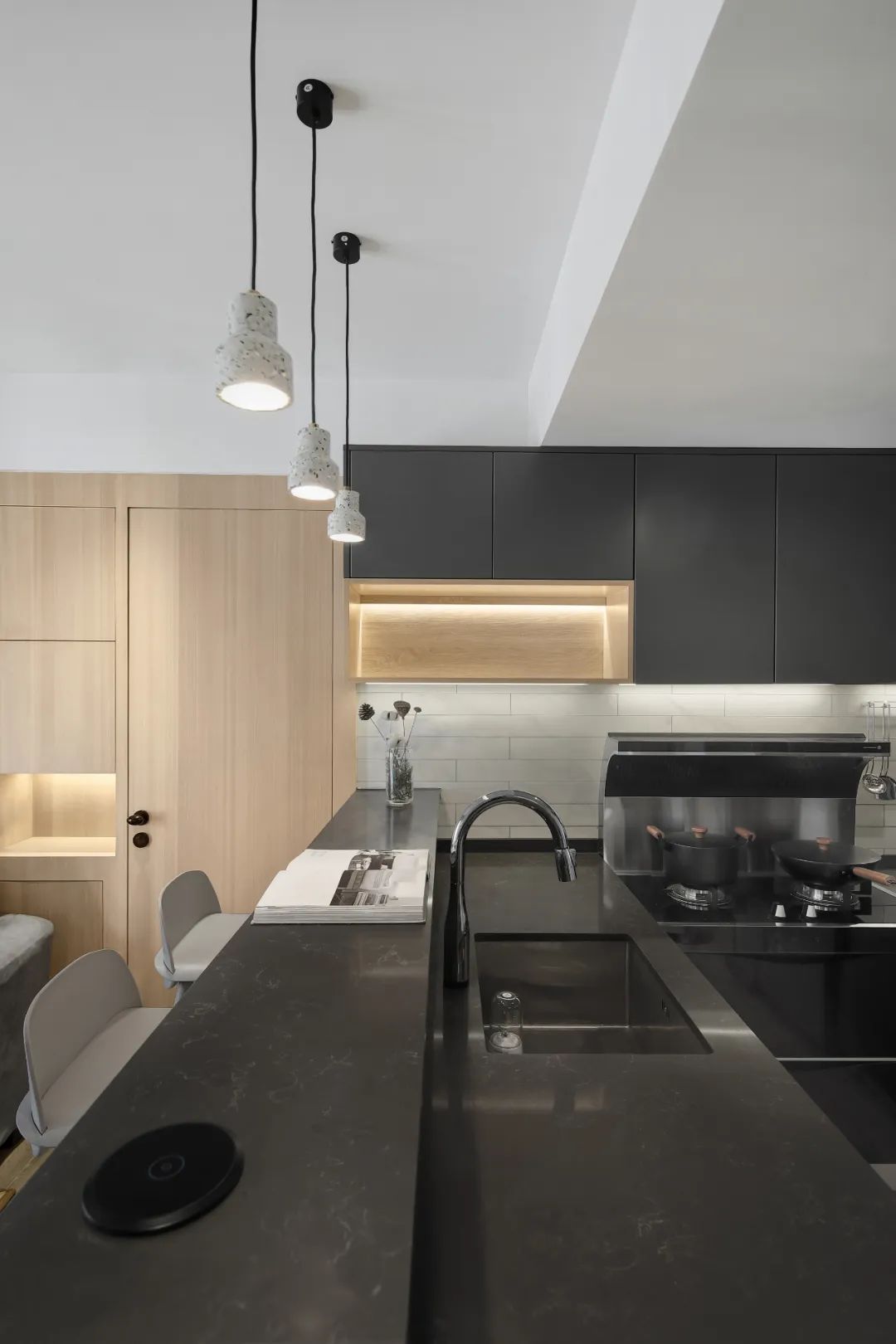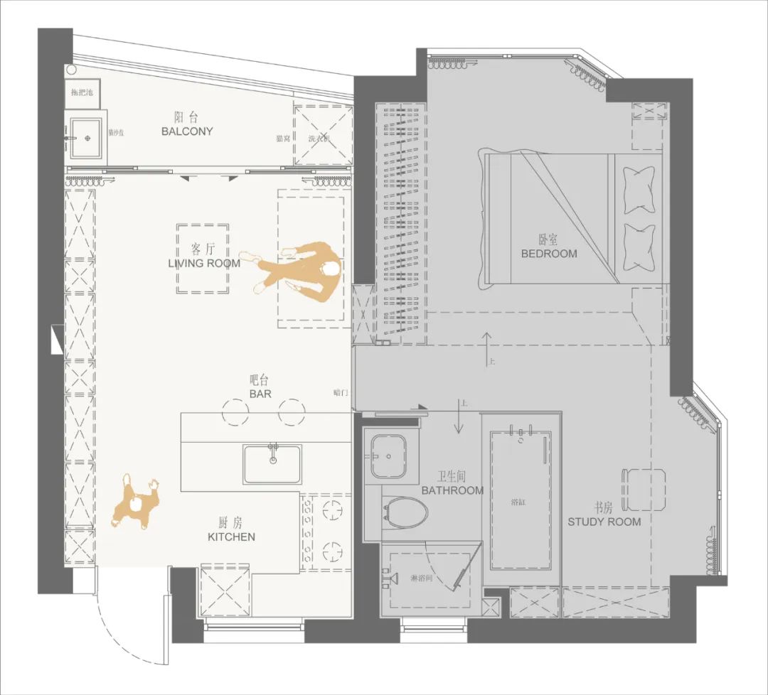 設計對空間進行打破重組,將空間規劃為公共區域和私密區。公共區滿足交流會客,就餐需求。私密區主要是衛生間,書房,臥室功能。臥室設計為臺階式榻榻米床,與飄窗做一個延伸。臺階式設計提供不同情境式的交流場景和視野,同時增加抽屜收納。