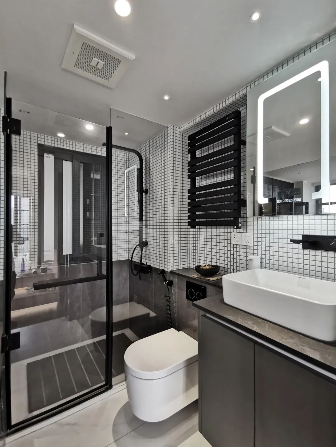 衛生間區域整潔雅致,黑白色瓷磚相互搭配,營造簡約氛圍。