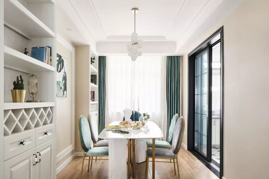 在房子另一側(cè)的餐廳空間,兩個餐邊柜中間留出了裝飾的背景墻,同樣精致優(yōu)雅的餐桌椅,讓餐廳也變得更為高檔大方