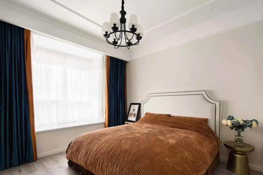 主臥干凈的墻面基礎(chǔ)氛圍,造型優(yōu)美的床頭靠背搭配橙色的豎紋被單,而飄窗內(nèi)側(cè)掛上橙色拼深藍(lán)的窗簾,呈現(xiàn)出一個滿滿活力的空間。