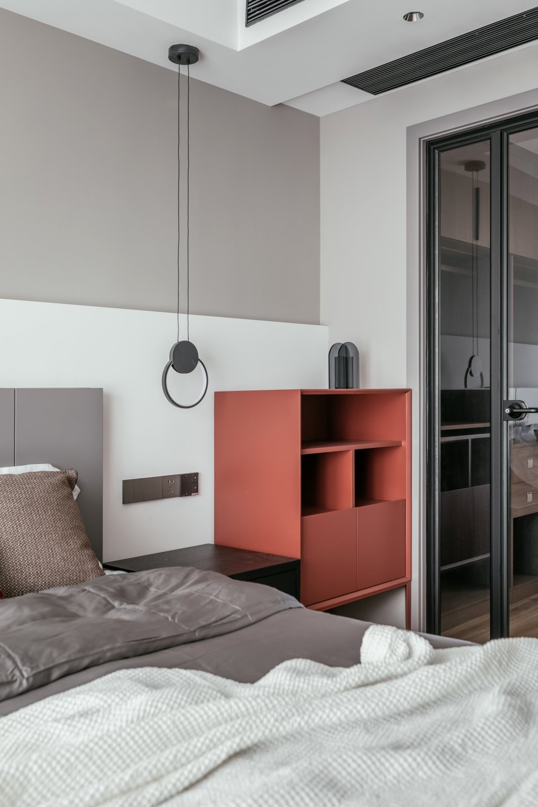 紅色的鐵藝收納邊柜,顏值高又實用,與床圍的紅色邊柜相呼應,讓整個睡眠空間更加輕松愉悅。原木色系衣帽間與衛(wèi)浴相連,生活的舒適與精致讓幸福感倍增。