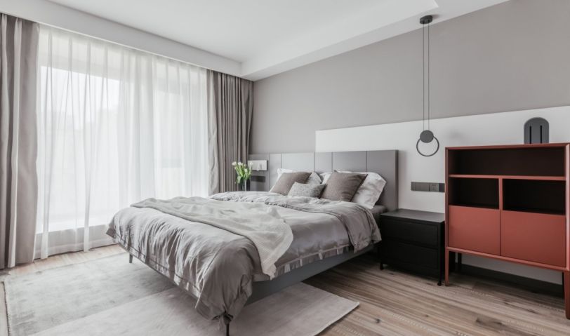 臥空間,設計師將灰色與白色疊加進行拼接,為背景墻帶來了形式上的變化。線型燈垂墜而下拉伸了空間的視覺感,又極具藝術氣息。