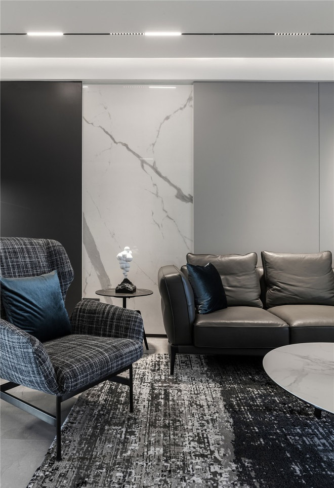 材質顏色上面使用了深灰色的護墻板,中灰的皮沙發還有地毯,黑色巖板的電視柜,角幾和單人椅子加上華爾思音響。通過多處巖板過渡,使得整個空間顯得非常有層次感和***感。