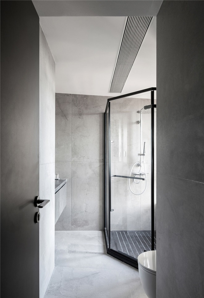 衛生間以灰調墻磚配以白色潔具,還是和客廳一樣的基調。設計了無擋水條的處理。淋浴區下沉3公分,加長型地漏。注重整體性,所有包括客餐廳的地磚及衛生間墻地磚,采用了美縫劑。盡量找和磚最接近的顏色。