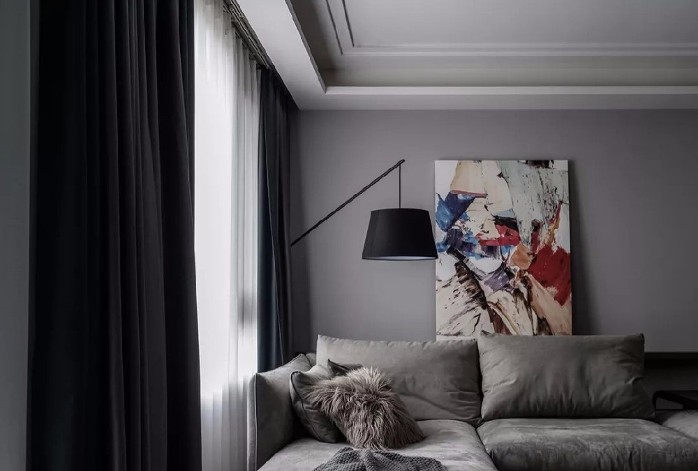 客廳的窗簾是天鵝絨拼色的,拼接的是時下流行的墨綠色,窗紗是特意找了垂感比較好的紗簾。