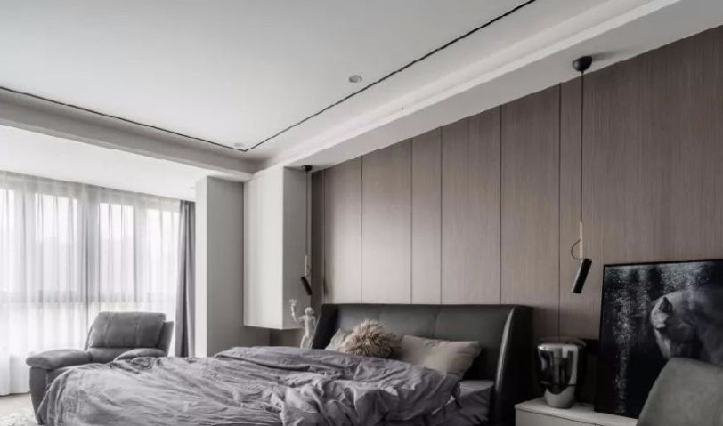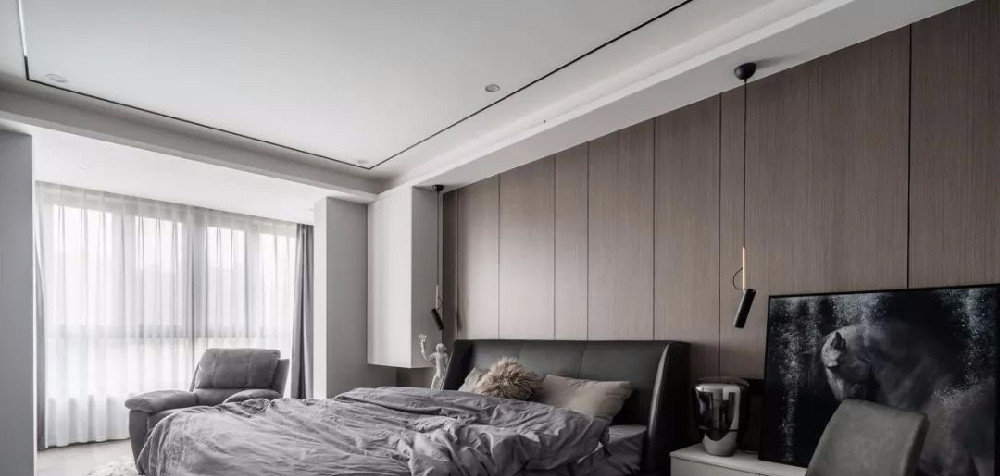 主臥的頂面用的是黑色不銹鋼金屬拉絲溝邊,床背景墻用的木飾面,中間自然留槽,兩邊都是床頭柜,一邊上方還加了一組日常雜物收納的儲藏小柜。