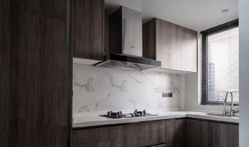 由于廚房原有面積較小,設(shè)計師選擇敲掉兩面非承重墻體,做了開放式中廚,平時業(yè)主的整體入戶活動動線也會非常舒服。墻面的爵士白瓷磚和石英石的臺面都是統(tǒng)一顏色的,相互呼應,左側(cè)是中廚的嵌入式單門冰箱位。
