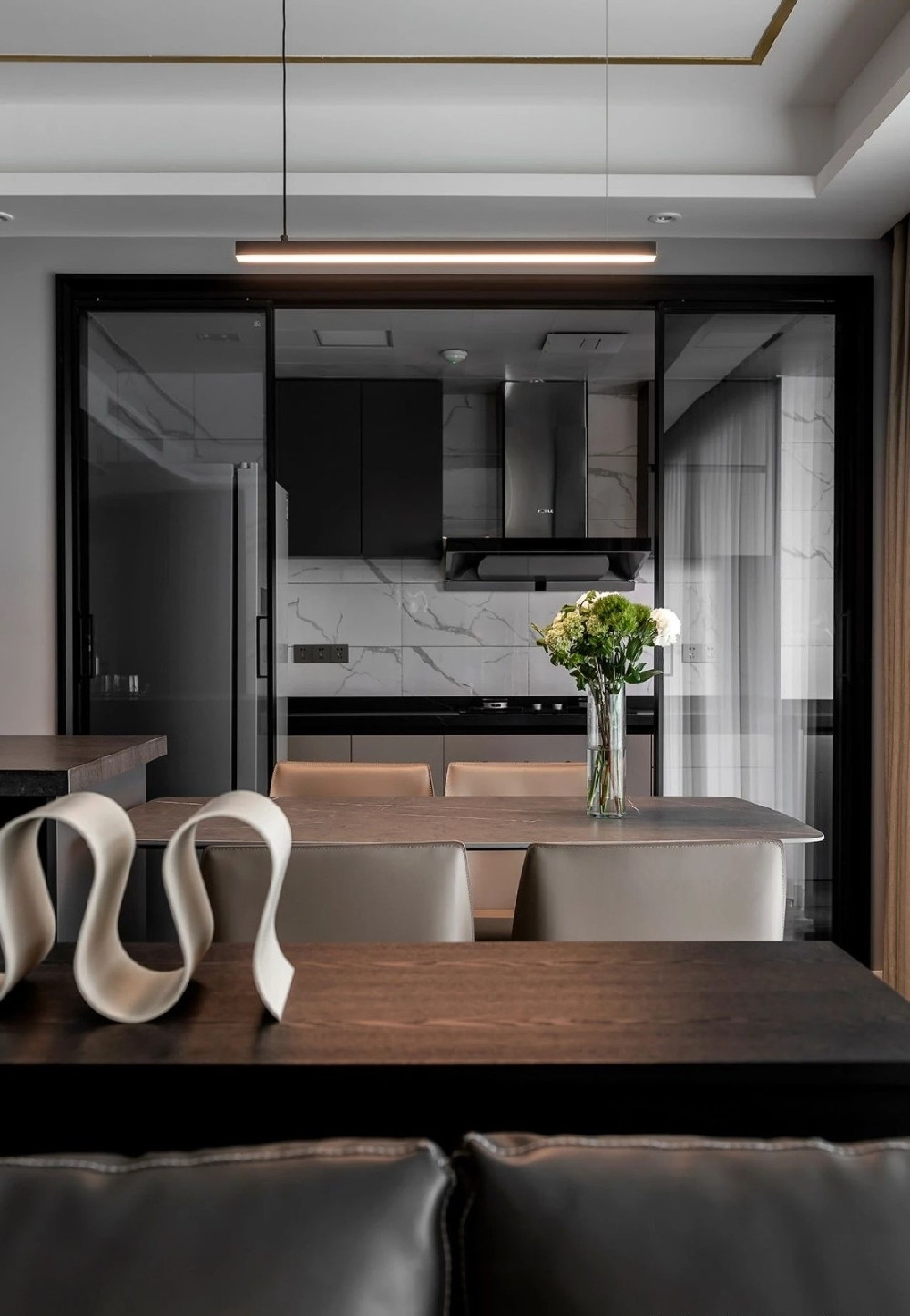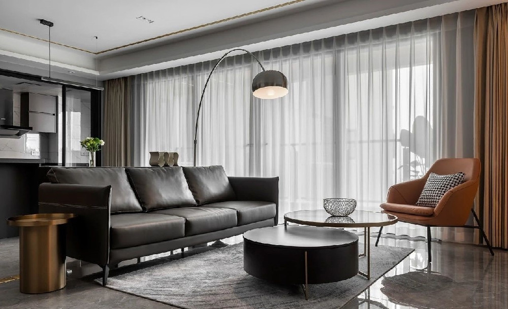 客餐廳以灰色為主調(diào),深色主沙發(fā)配高飽和色休閑椅,金屬元素點(diǎn)綴精致細(xì)節(jié)