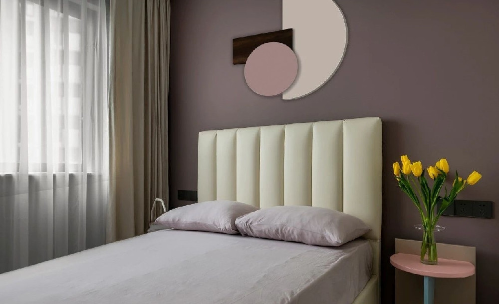 另一個(gè)次臥以?xún)?yōu)雅柔美的風(fēng)格打造,紫粉色系的墻面與墻飾搭配米白色床架,床頭柜俏皮有設(shè)計(jì)感,與墻飾呼應(yīng)