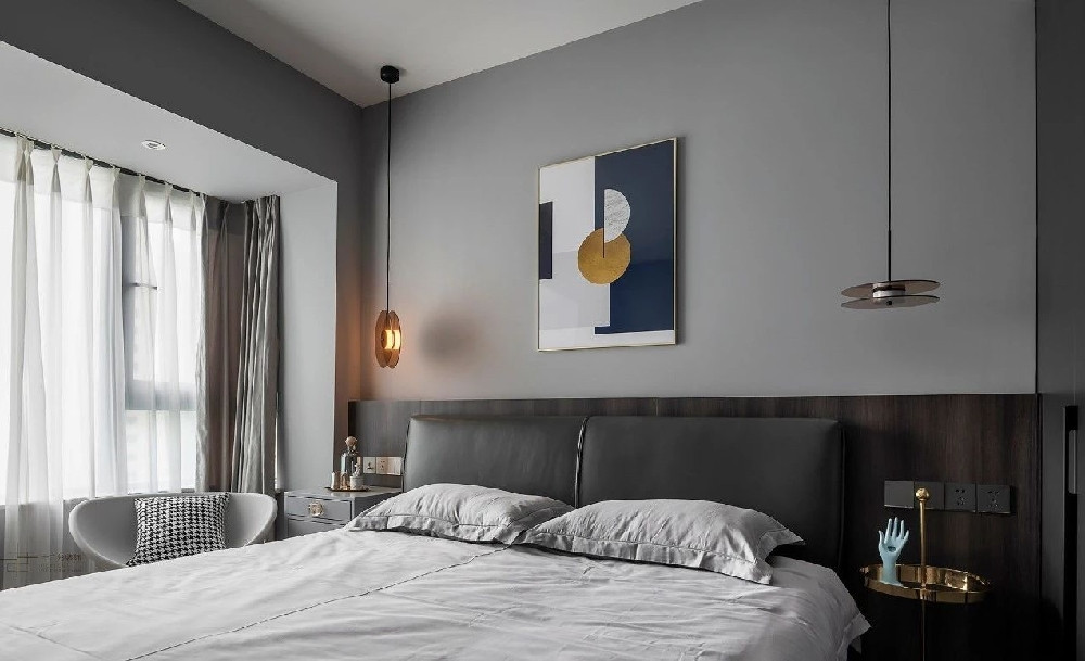 主臥的主色調(diào)延續(xù)客廳基調(diào),黑灰色中點(diǎn)綴些許金屬色提亮
