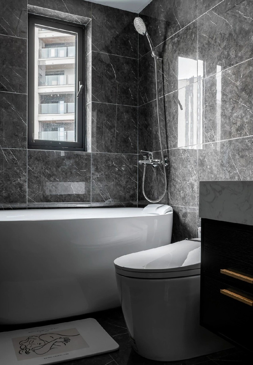 衛(wèi)生間,深灰色石紋瓷磚滿鋪搭配潔白的衛(wèi)浴,實(shí)用與顏值兼具