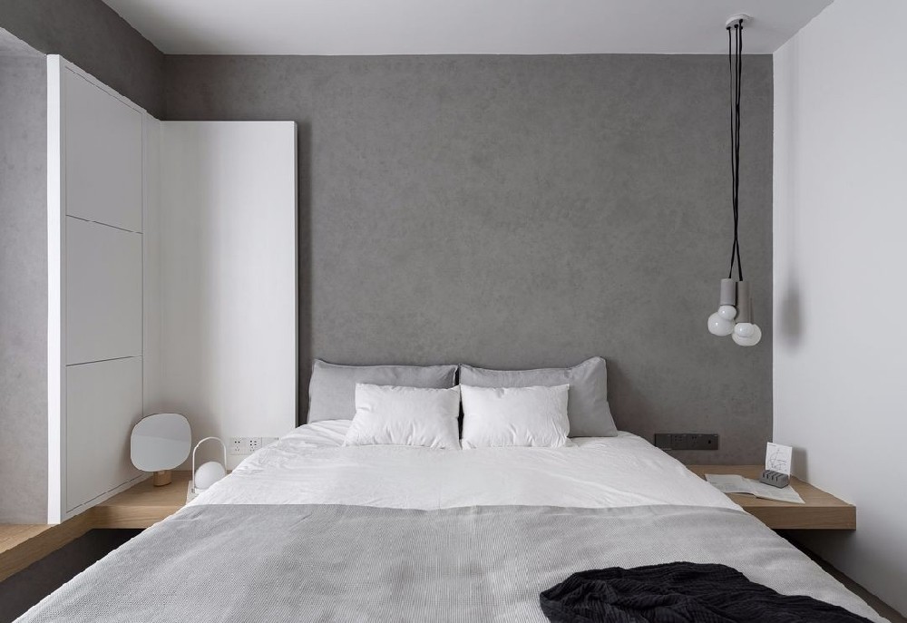 臥室在風格上延續主空間的搭配方式,在形式上則重點營造舒適度還原一個睡臥空間應有的狀態,在墻面水泥材質的基礎之上左右兩面又分別做了白色墻面及體塊,營造了一種被包裹在其中的舒適及安全感,白色體塊是利用了飄窗一部分空間做了臥室的集中隱蔽收納,邊緣部分又合理的結合了藏光為睡臥空間帶來豐富且舒適的光源環境,觸手可及的加大加深床頭飄板讓人使用起來更加有滿足感,床頭飄板和飄窗的臺面是相互延伸的造型起到了很好的空間拉伸作用。