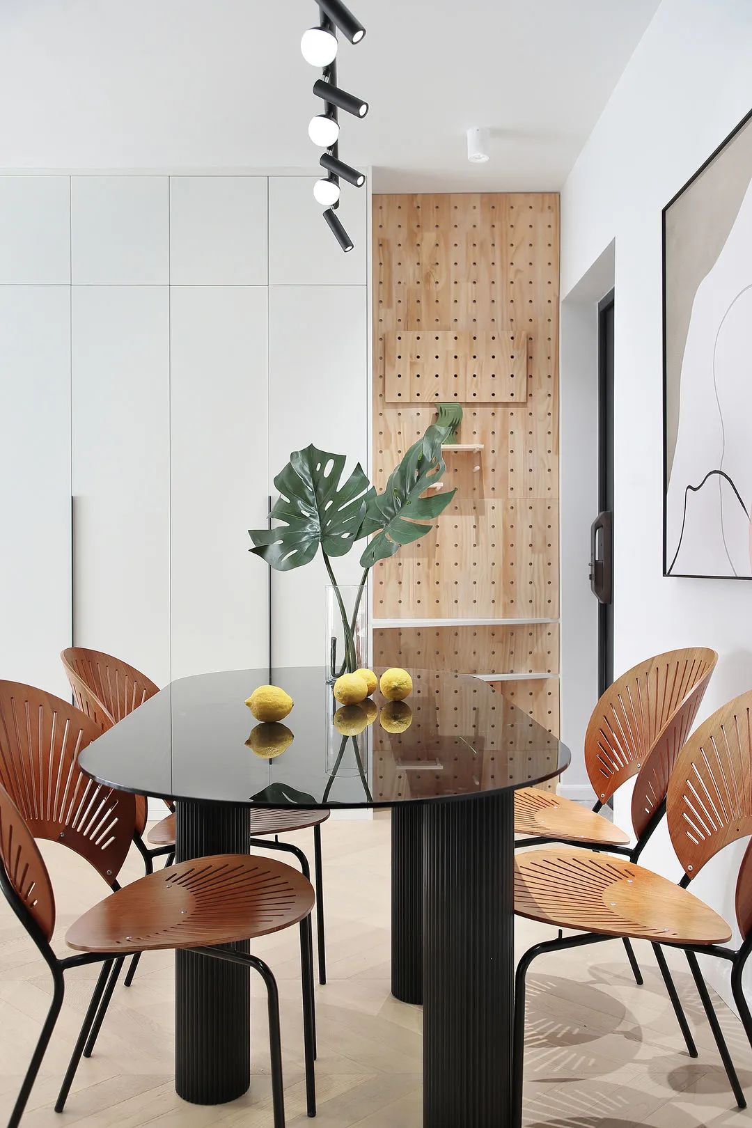每一把椅子都是家里的藝術品,曲線的優雅,鏤空的設計,餐桌上方吊燈的光線穿透椅子,呈現出扇形的光影。