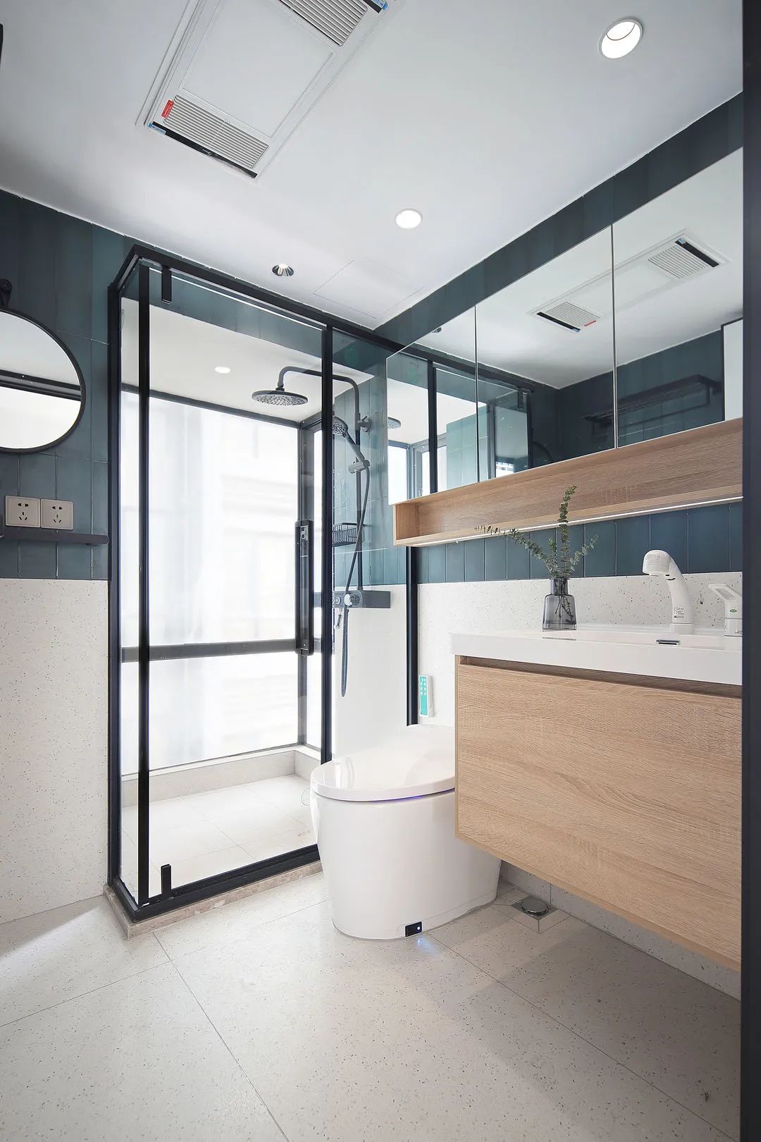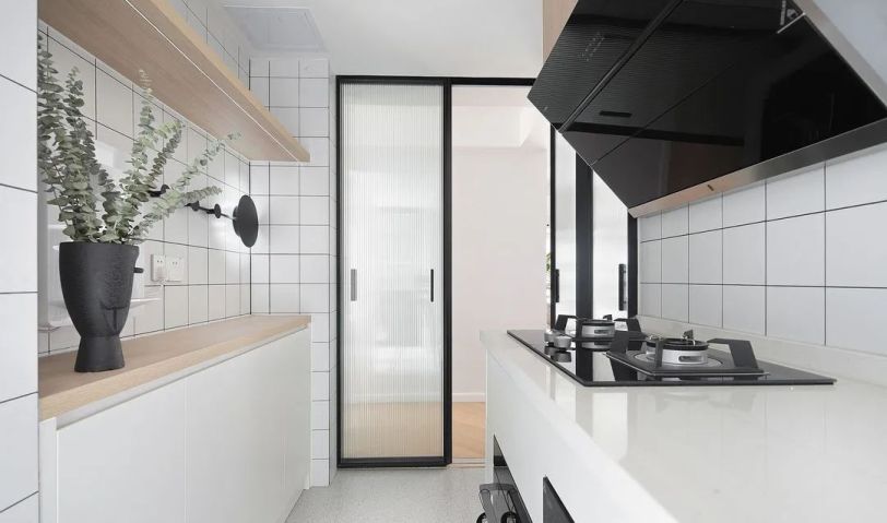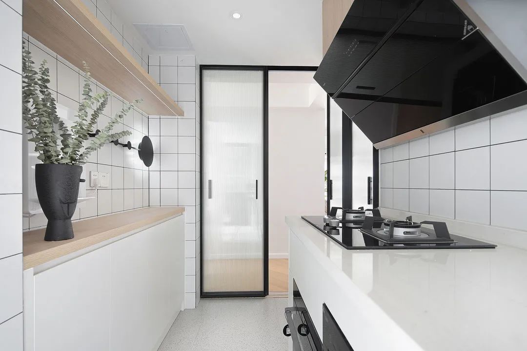 廚房做了無主燈設計,筒燈能讓整個空間更溫暖明亮有層次。原木色搭配小方磚、水磨石地板,整個空間清新自然,加入長虹玻璃的滑動門,為廚房空間賦予了另一種情調。下方做柜子,完美解決收納問題。