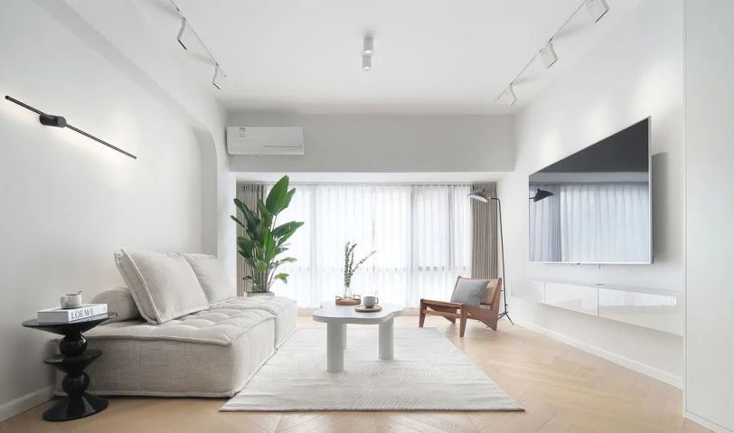 整個空間都是呈現出簡約的狀態,木色作為地面基色搭配素白的色調,綠色作為跳躍色,剛好拼湊在這個空間里。在設計上,沙發背景墻設計了一個有弧度的造型,提升線條美感,放眼望去,會比直角更加柔和。