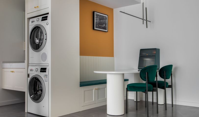枯黃色乳膠漆使整個餐廳空間的氛圍更加溫暖,客廳采用卡座設計,增加儲物,滿足功能需求。