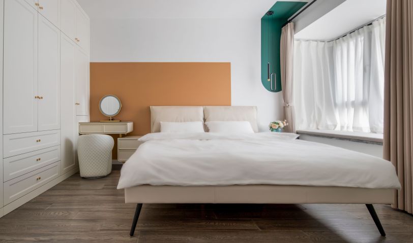 主臥采用了簡約的家具但是滿足了足量的收納需求,頂部隱藏式燈帶讓臥室更加有設計感,背景墻采用乳膠漆分開拼色使主臥空間更加生動有趣。