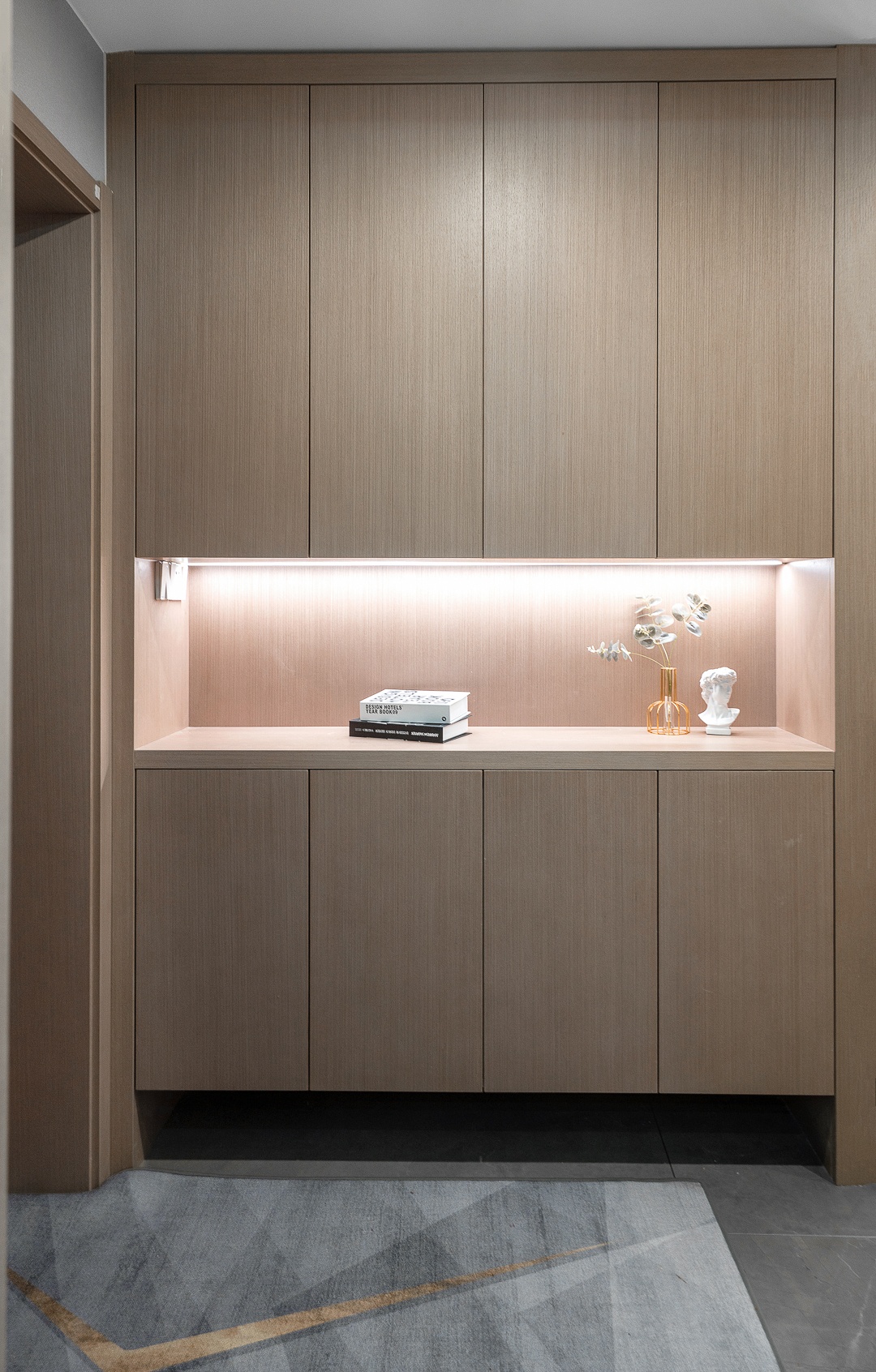 入戶一側以原木打造玄關柜體,給人以清爽自然之感。通頂式柜體收納充足,中間挖空嵌入燈帶,氛圍感升級,儲物空間更加多元化。