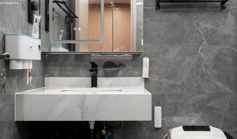 灰色系的衛浴空間時髦腔調十足,配合燈光氛圍感,營造出小而精致,且不失溫度的舒壓空間。