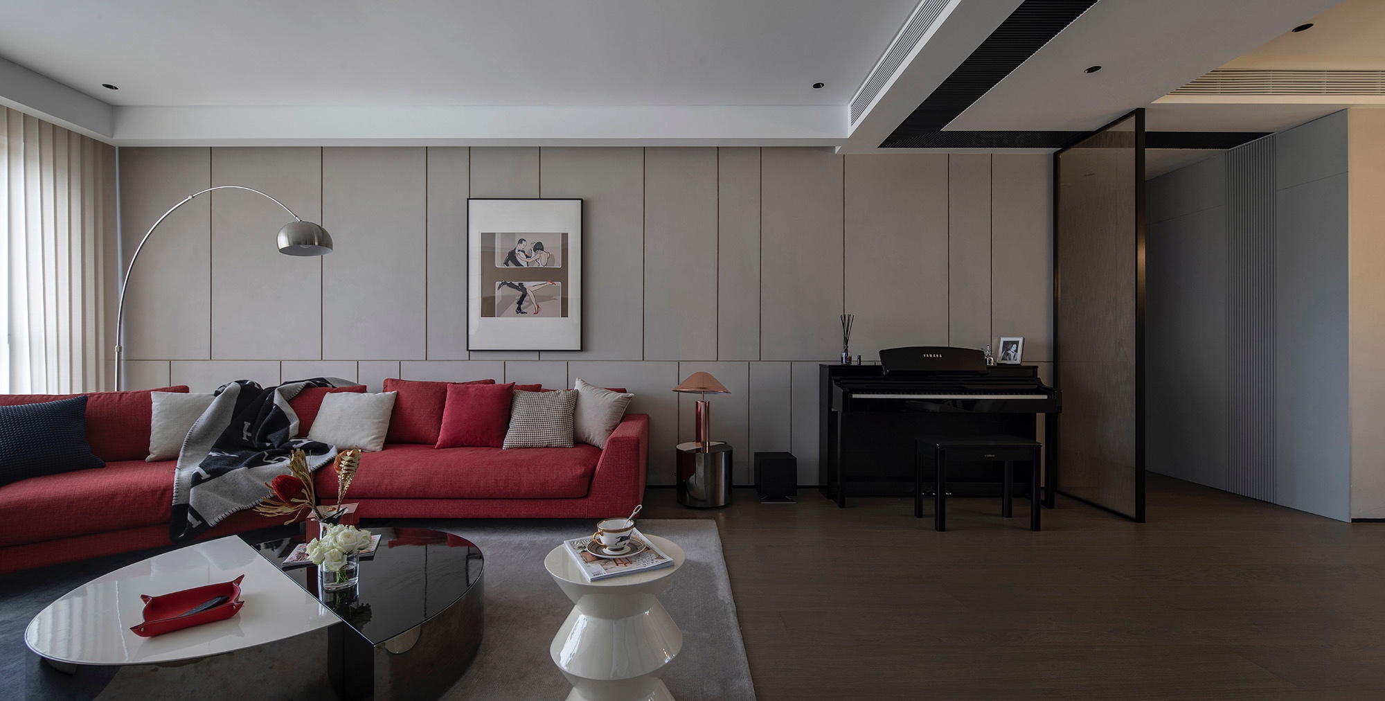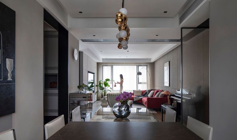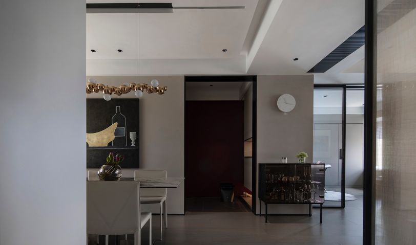 垂直線條游離于刻意與無意的形態之間,營造出穩定的空間感,拼接灰與白,穿插黑色,加強了縱深尺度,讓玄關擁有了開門見山的意趣。以輕托重的設計手法,塑造出柜體質感,光影相伴,浪漫愈發豐盈。