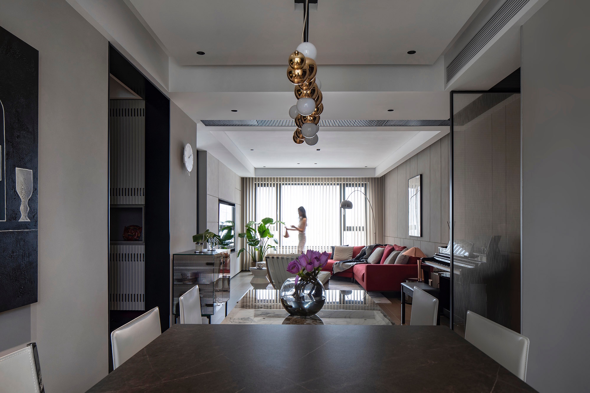 從低處延伸至高處,形成規整的就坐場景,選用亮面材質碰撞溫潤觸感,展露出頗具摩登型格的視覺張力。搭配球狀組合吊燈,通過錯層的結構與纏繞的光影,襯托美食,緊扣浪漫,沉淀時光,定格親密。