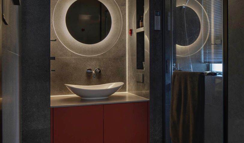 透明飾面分隔出干濕區域,并未隔斷衛生間的整體性視野,以透光質感染盡光的尺度,闡明了設計脈絡。在墻壁上補充置物功能,搭配定制柜體,強調品位與個性,滿足收納需求,帶來高級的生活體驗。透明飾面分隔出干濕區域,并未隔斷衛生間的整體性視野,以透光質感染盡光的尺度,闡明了設計脈絡。