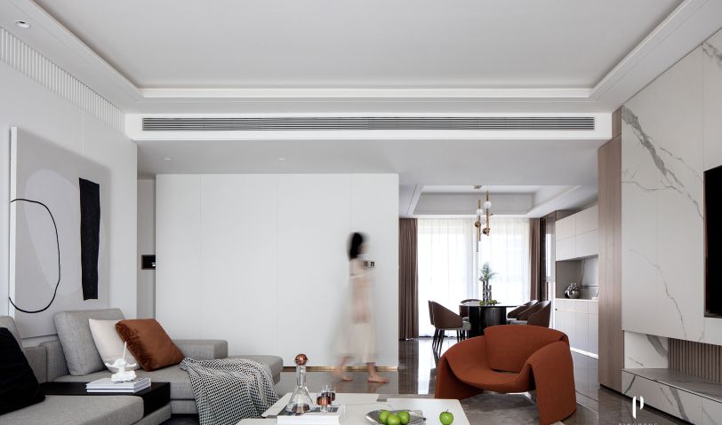客廳不加修飾的白色背景墻通過錯層形式豐富視覺效果,個性的家具提升了整體空間的調性?;疑纳嘲l具有超級精致的視覺感受和舒適體驗,灰與白的界限中,融入橙色的單體沙發,在空間中劃出鮮明色調,多了些許生活的溫度,與空間完美契合。