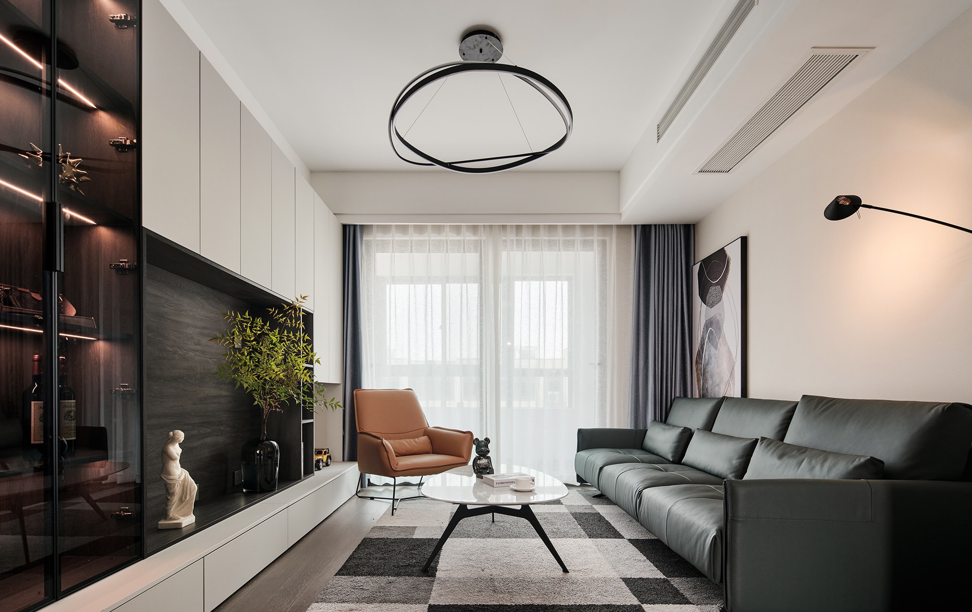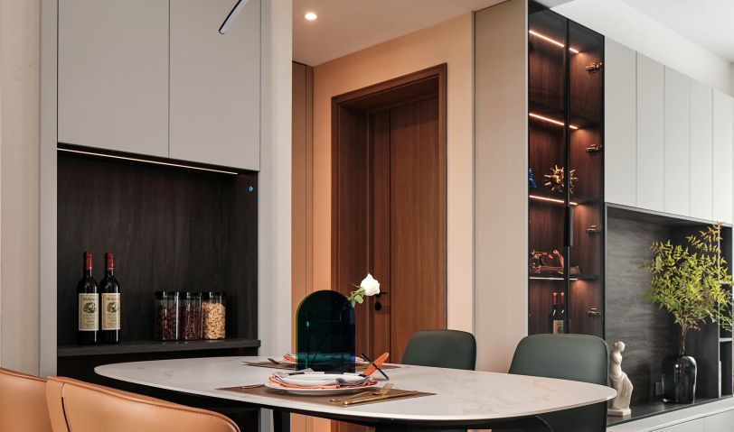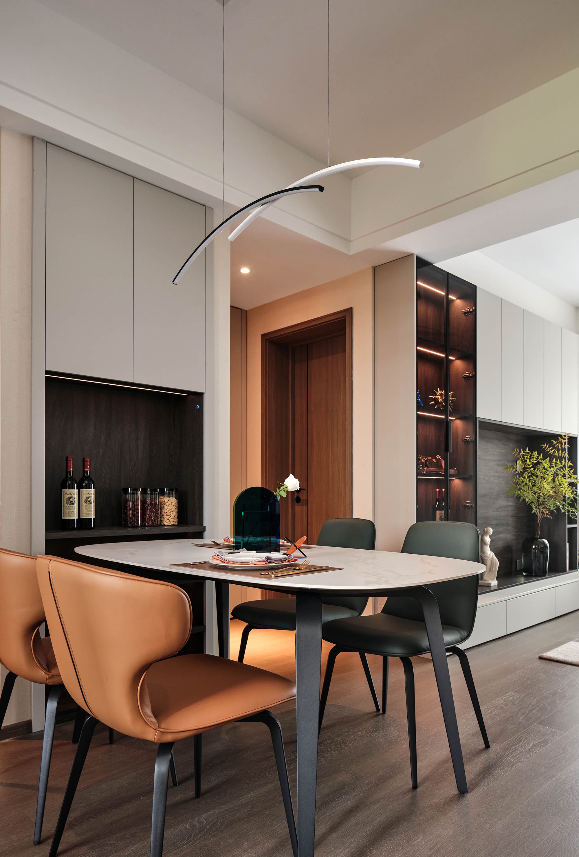 空間記錄著自然光隨性穿梭的氣韻,將簡奢、明亮、低調的多種元素混合搭配,塑造出都市美學的簡約型格。上淺下深的用色法則運用,既展露材質的溫潤美感,又以與人互動的體感和動線沉淀出高雅品味。