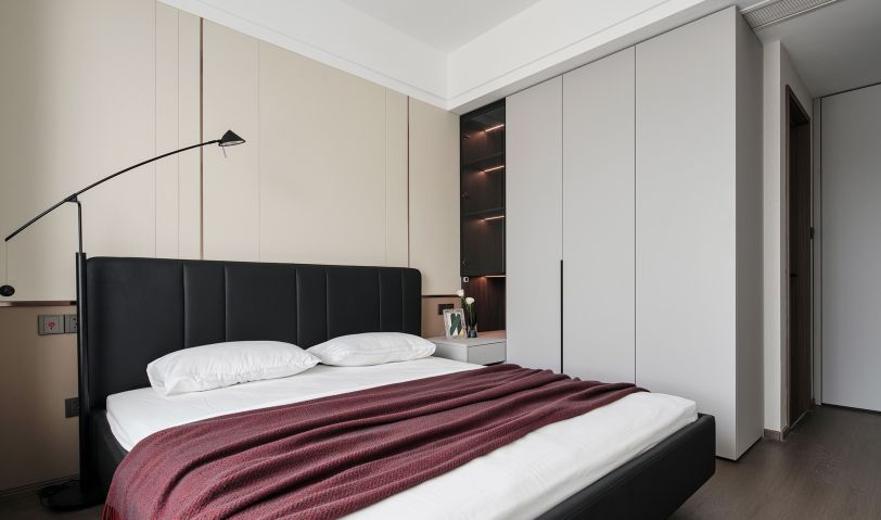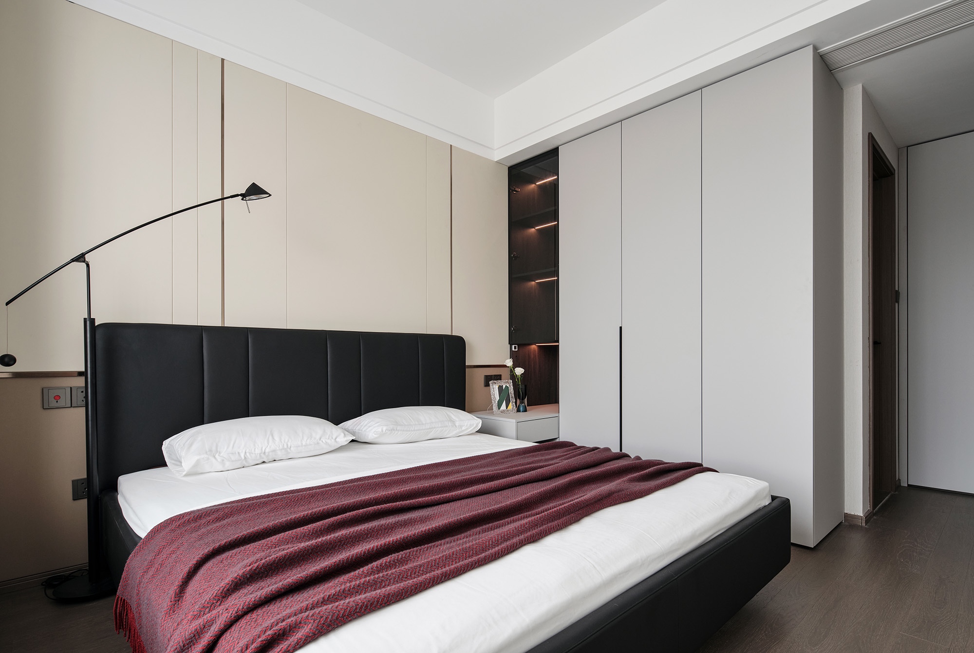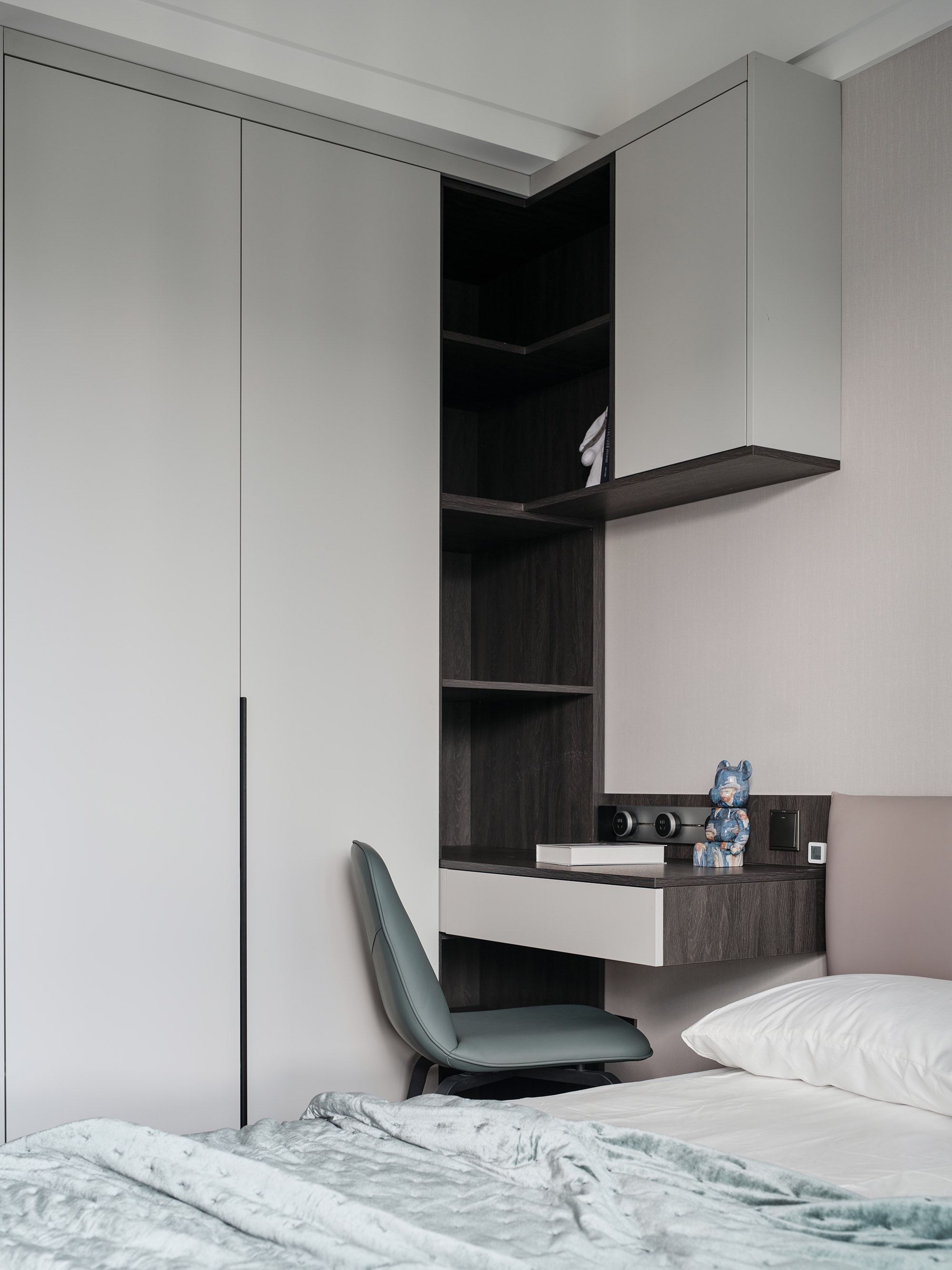 選用暗色調加強空間的簡雅質感,借細膩木紋為睡眠環境嫁接親密性,串聯富有情調的布藝,隨著豎向線條的分割、轉折、排列,流露出沉靜的氣氛。定制通頂柜體保持統一美感,布置層架細節,表達收納和展示的趣致。
