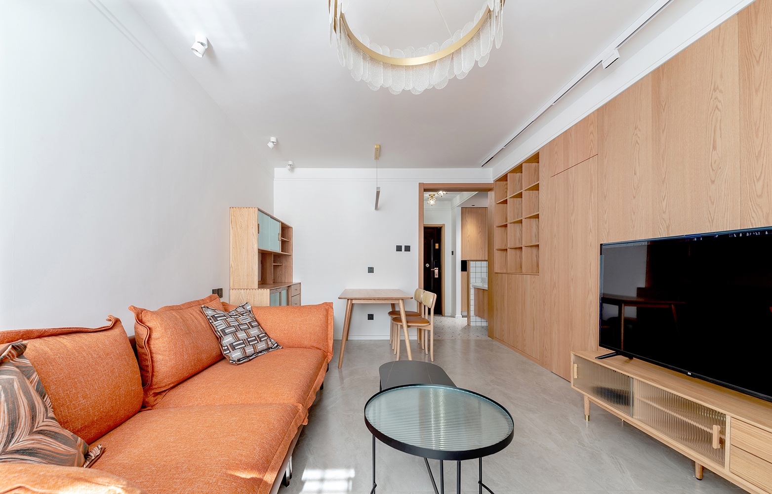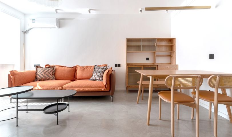 沙發背景墻相對簡潔,餐柜餐桌椅選了接近電視背景墻一樣的用色,保證空間的材質盡可能的統一