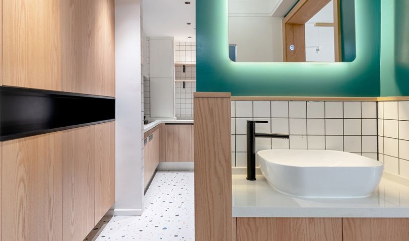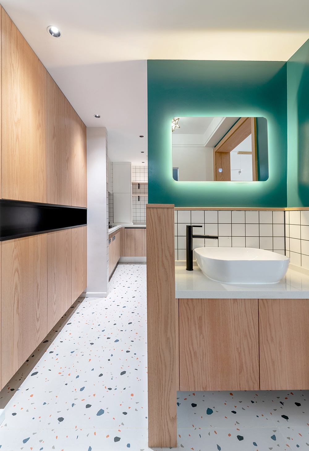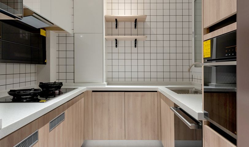 廚房空間擴大以后增加了操作和儲物空間,女主喜歡烘焙,特意增加了烘烤箱。網紅小白磚搭配水磨石,顏值滿滿,讓空間成了大顯身手的地方。