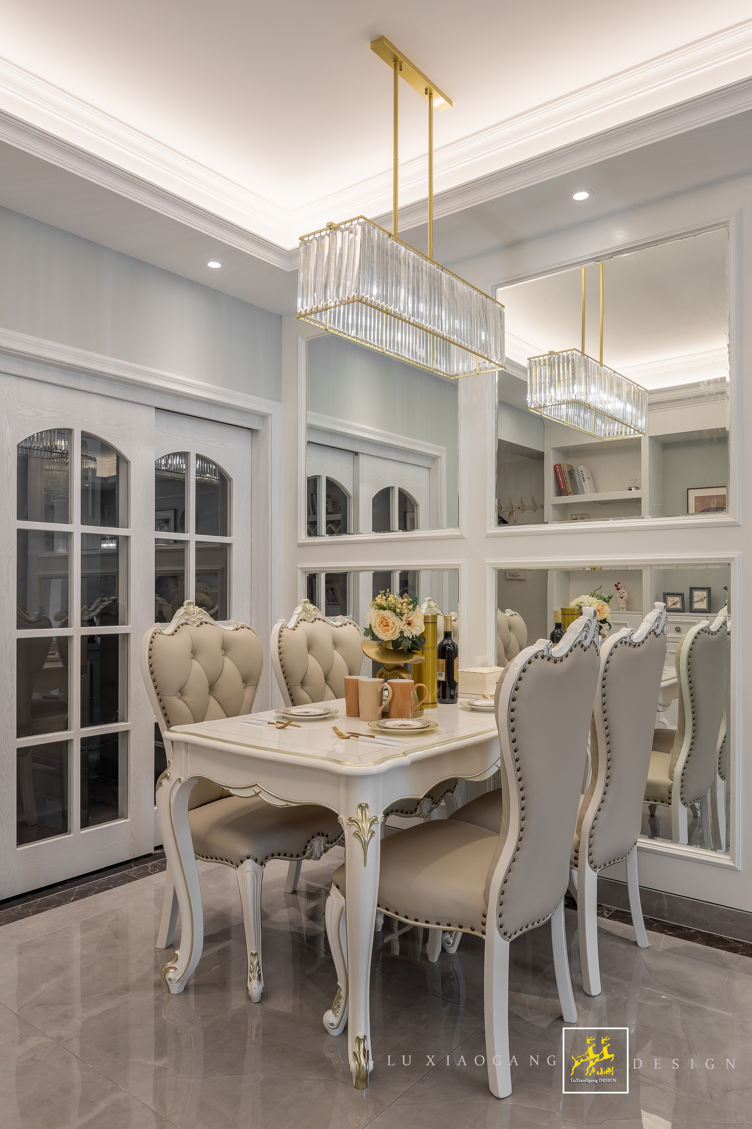 穿過玄關進入客廳,客餐廳空間的無障礙銜接,增加了空間的延續(xù)性。客廳的整個空間采用了淺色系復古色調(diào),打造出了別樣的暖系歐式浪漫。