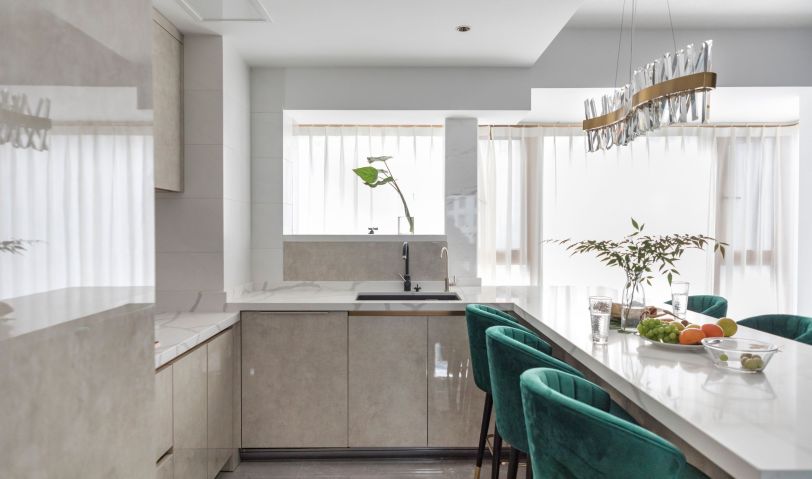 開放式廚房中間的島臺(tái)兼具用餐以及會(huì)客功能,右側(cè)將冰箱、烤箱等設(shè)備嵌入收納墻中,設(shè)計(jì)感滿滿的同時(shí),也提升了空間的功能性。
