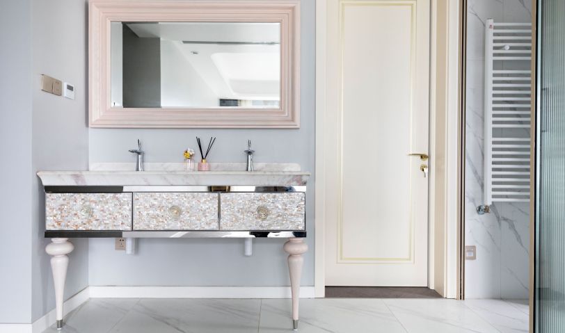 主臥衛(wèi)生間采用長(zhǎng)虹玻璃,讓空間的通透性保證最大的情況下又保證的隱私。香檳金的窄邊框與整個(gè)空間干凈的配色又美又協(xié)調(diào)。