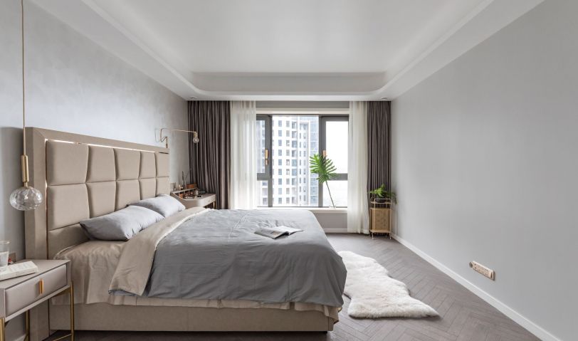 主臥休息區(qū)與衛(wèi)浴區(qū)分明又相呼應(yīng)。地面材質(zhì)的分割避免了衛(wèi)浴區(qū)水侵泡地板的可能,細(xì)節(jié)的處理用收口邊條阻擋了水的蔓延。主臥采用無(wú)主燈設(shè)計(jì),同時(shí)主臥背景墻采用跟客廳頂部一致的藝術(shù)漆,讓空間的設(shè)計(jì)元素得到延伸,整個(gè)空間顯得干練又明快。