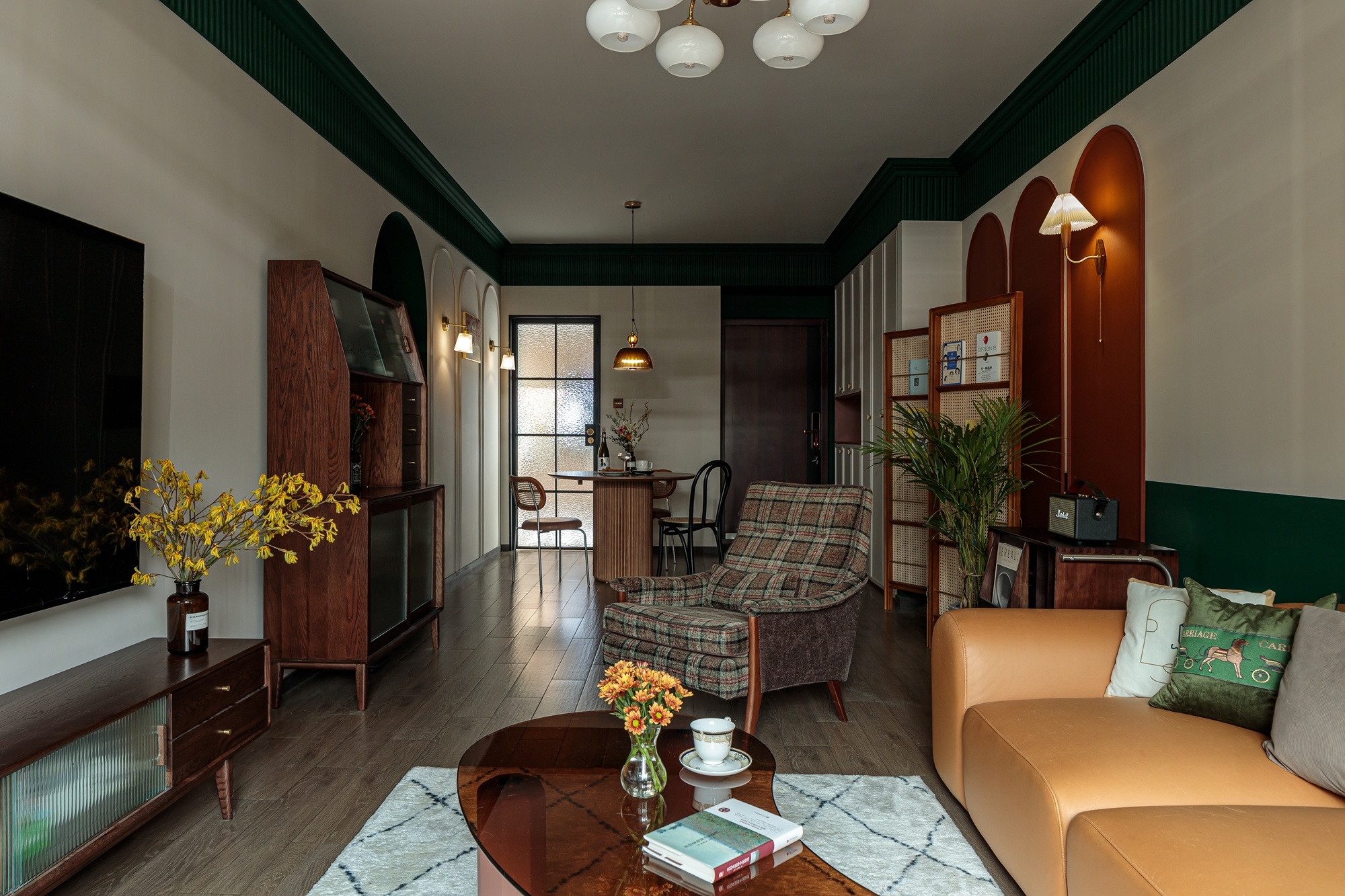 以色塊為墻體造型,壁燈、復(fù)古掛畫、都是屋主喜愛的配飾成品,將這些集合為空間的故事素材,進一步豐富墻面的質(zhì)感。在紅綠之間融入淡金色沙發(fā),本身自帶的精致復(fù)古氣息,流連的金屬味道香醇而低調(diào),散發(fā)出舒適的溫暖氣氛。
