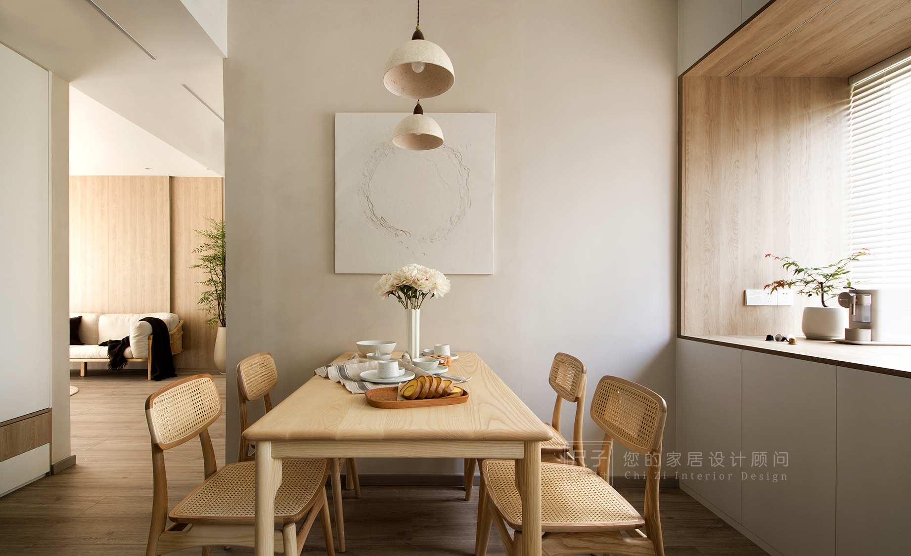 原木餐桌、藤編元素的餐椅給空間增添了一抹古樸的自然感,鮮花與枝葉點(diǎn)綴其中,為空間注入一股明媚的生機(jī)。