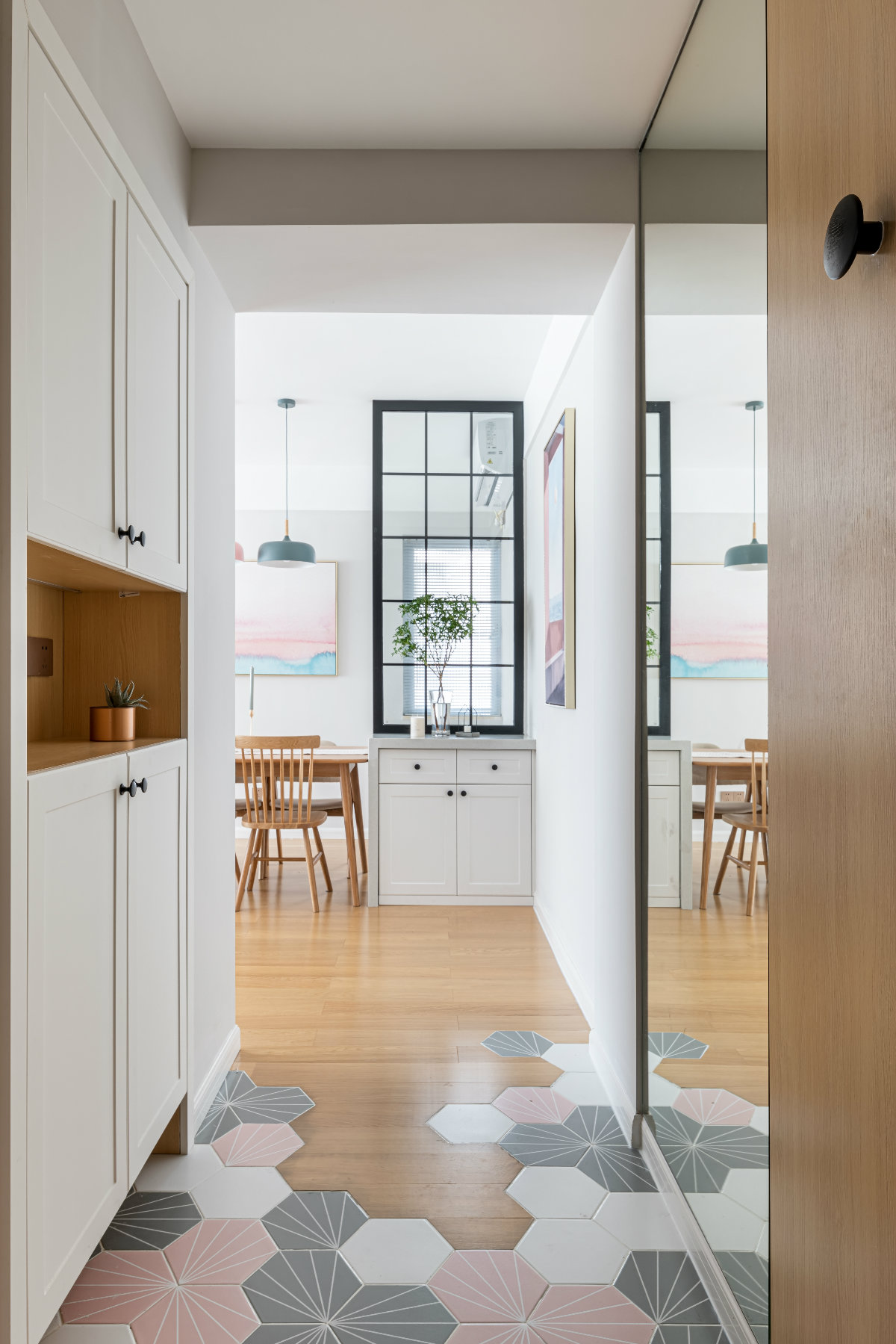 玄關(guān)進(jìn)門右手邊墻面比較長,為了避免形成比較長的走廊,在右手邊的墻面上采用大面積鏡子與左邊鞋柜同寬,既可以擴(kuò)大視覺效果也可以起到穿衣鏡的效果。另一半則用木飾面拼接,打底后完成面與鏡子做平,點(diǎn)綴紐扣掛飾,方便進(jìn)門隨手掛起來包包等物品。鞋柜從廚房借出位置,鞋柜下部鏤空15公分,裝有燈帶,可以方便換鞋,也可以放置掃地機(jī)器人的充電。中部鏤空部位可以放置小物件,同樣留有燈帶。玄關(guān)天花的燈具是感應(yīng)的內(nèi)嵌式筒燈,可以聲控和紅外控制,這樣晚上回來打開門便會(huì)亮起來,是不是滿滿的儀式感呢!玄關(guān)長方形考慮到需要與木地板的拼接,采用時(shí)下流行的六角磚,與木地板自然拼接。粉色,灰色,白色,正是我們整體的色彩搭配。