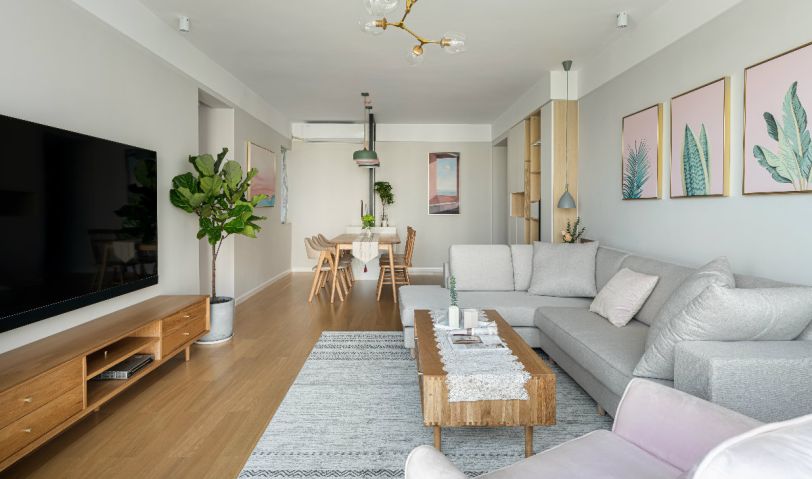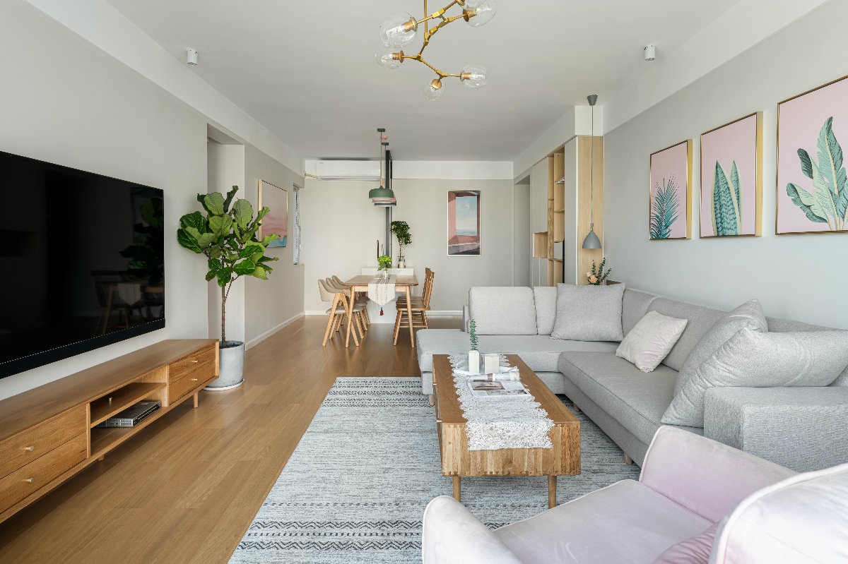 客餐廳以暖色墻面為主要背景基調(diào),灰色布藝沙發(fā)呼應(yīng),原木實(shí)木電視柜與茶幾同材質(zhì),與原木色地板一致,粉色掛畫與單人沙發(fā)和抱枕作為點(diǎn)綴,淡淡的慵懶的也很莫蘭迪!飽和度低的基底,綠色的植物,像春風(fēng)柔柔的拂過,又像冬日的暖陽灑下。