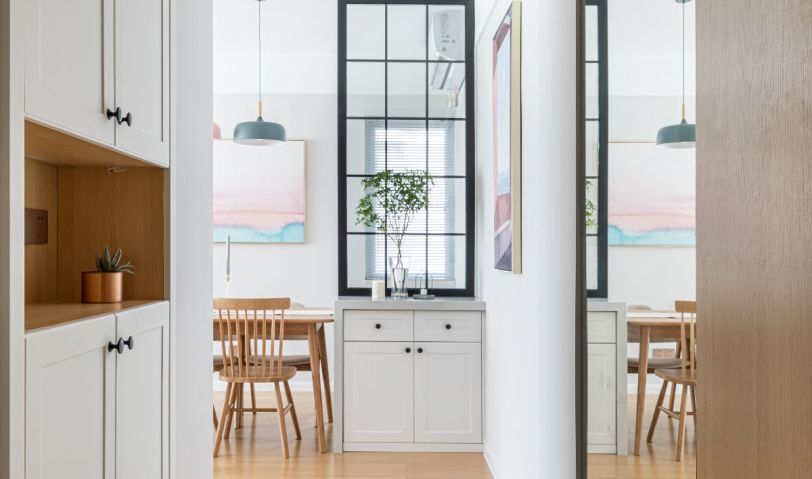 餐邊柜與屏風(fēng)的結(jié)合,既增加了餐邊柜的儲(chǔ)物功能,也隔斷玄關(guān)進(jìn)門即是小窗,增加玄關(guān)景的效果。點(diǎn)綴新鮮的植物或鮮花浪漫又溫馨。1800的大餐桌,親友過來聚餐,兩人餐桌上工作都沒有問題,餐椅選用溫莎椅和泰國椅搭配,也是很有意思,太太喜歡有扶手的椅子,先生喜歡實(shí)木椅子都可以隨意選擇搭配。