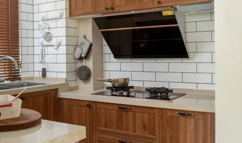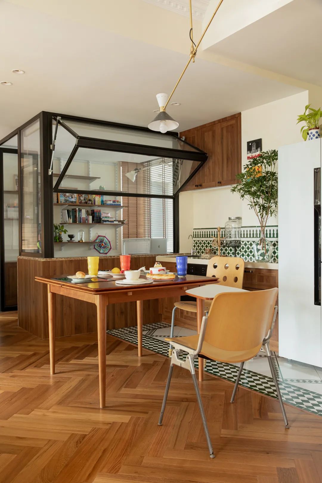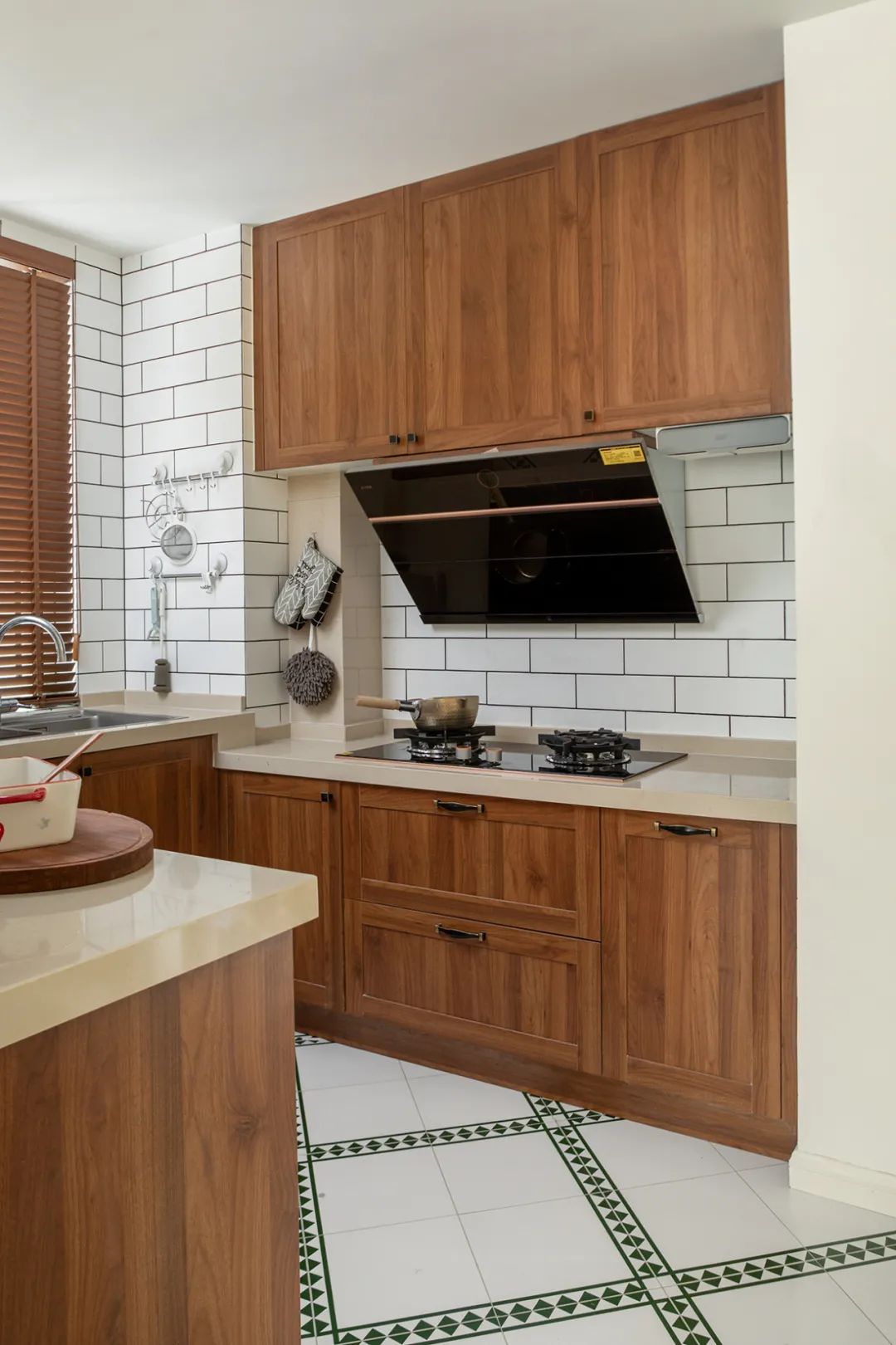西廚地面和墻面的復古小磚,靈感來自于巴塞羅那老式建筑,復古綠+幾何花紋,對稱清新,小的細節(jié)總會給人驚喜。