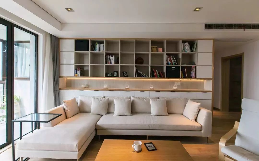 客廳沙發(fā)墻,裝了一排儲物柜,上面的開放展示架,收納書籍與裝飾品,地柜上方是一排留空的隔層,內(nèi)嵌燈帶,溫馨而又有層次感。