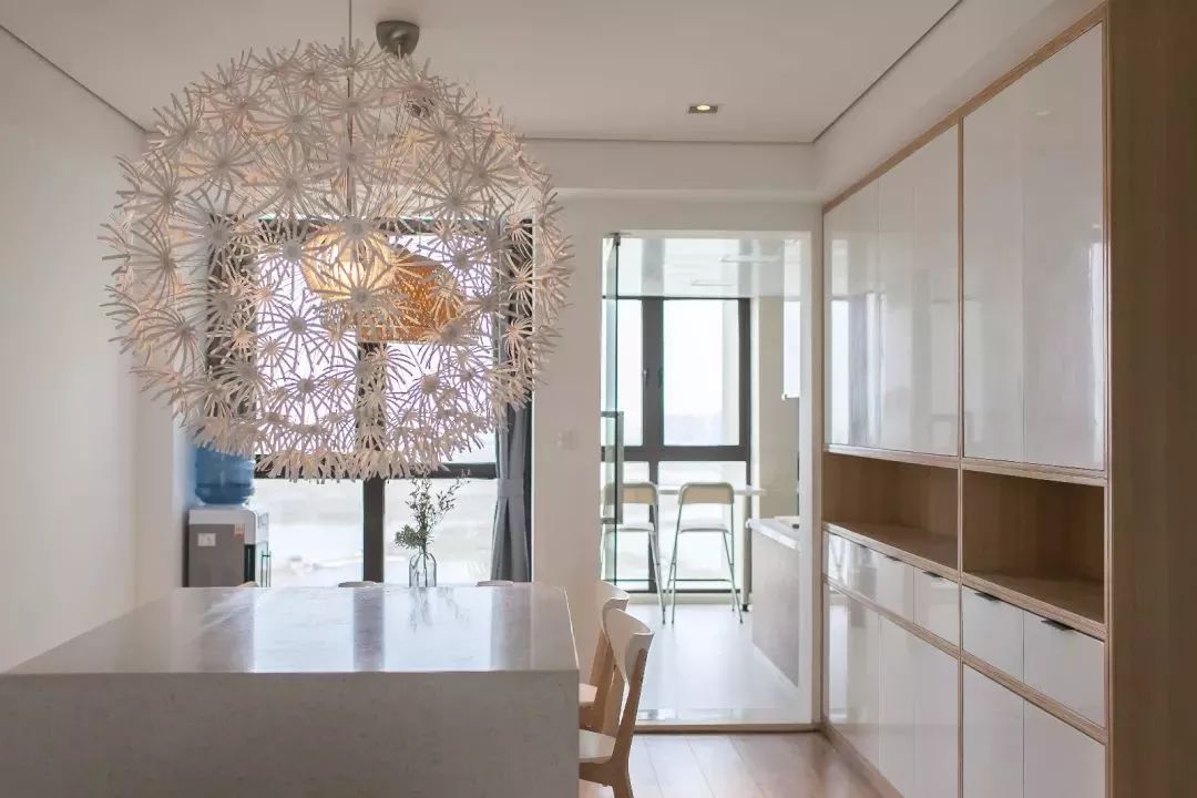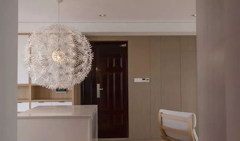 入戶右手邊,布置原木+白色拼接鞋柜,透過餐廳的球形燈,一進門就能感受到溫情優(yōu)雅的居家氛圍。