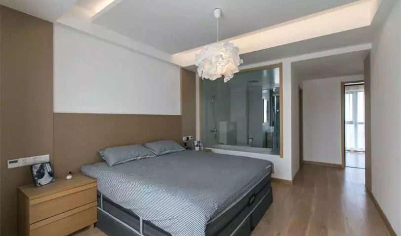 木質(zhì)床頭背板,搭配灰色的軟質(zhì)高床,簡單而舒適。主臥吊頂留空,嵌入燈帶,光線柔和溫馨,很適合放松休息,可以快速進入睡眠狀態(tài)。