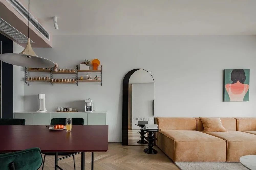 整個客餐廳墻面刷低飽和度淺灰色墻漆,電視背景墻刷天鵝絨藝術漆,地面鋪屋主喜歡的人字拼木地板,增加空間材質的層次感。