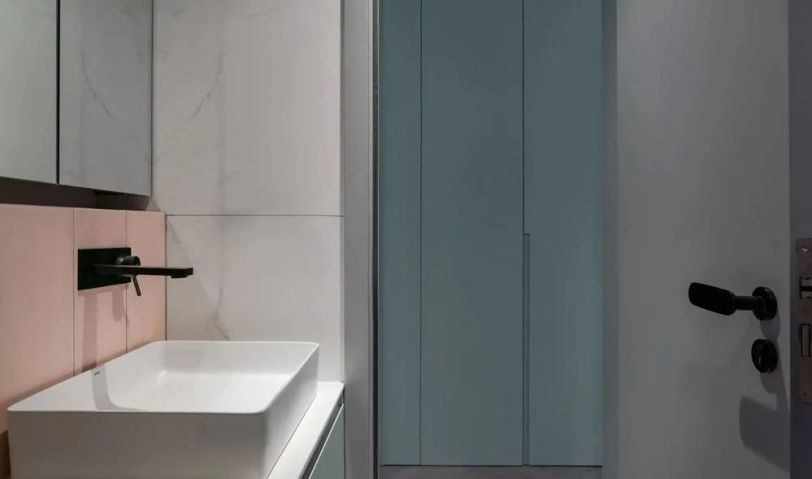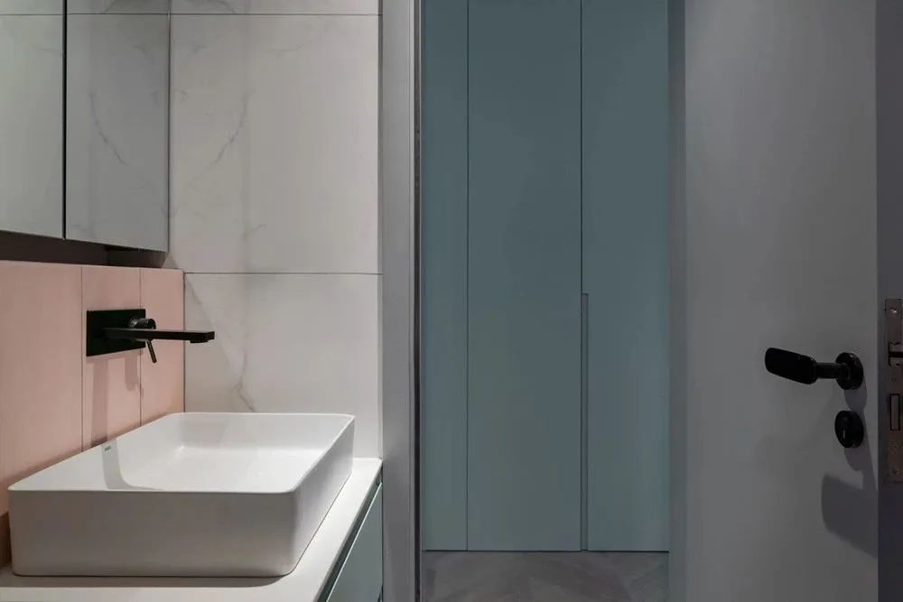 衛生間采用壁掛式馬桶,方便日常清潔。洗面盆上方利用暗埋龍頭和馬桶水箱的厚度做了一整面鏡柜,收納洗漱用品,功能強大。