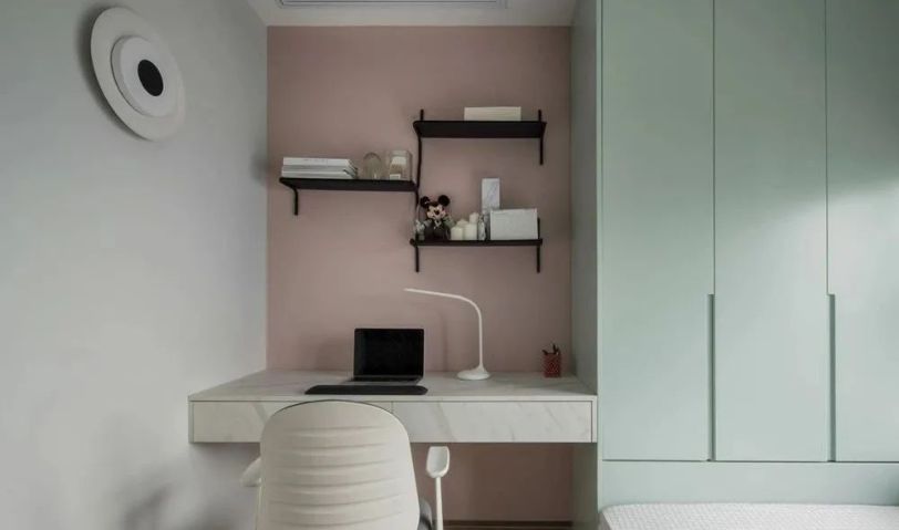 陽臺榻榻米部分墻面和頂面統一刷了淺粉色,柜體采用豆青色的烤漆門板,青春洋溢又不張揚。