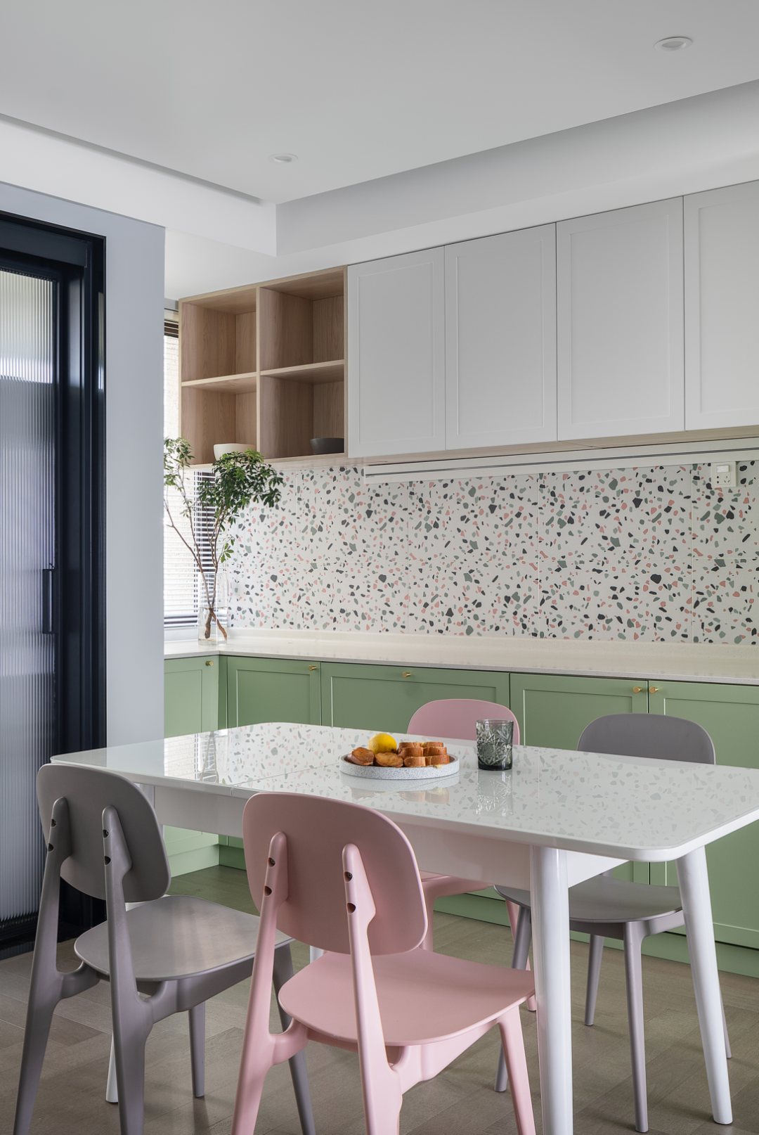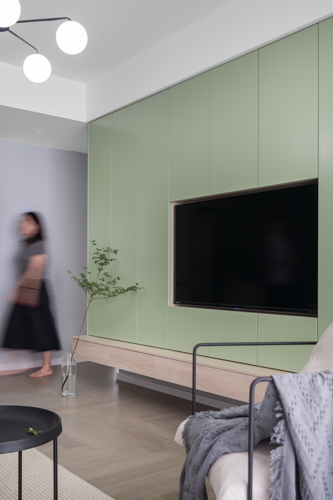 牛油果綠儲(chǔ)物柜讓人眼目一新,使得整體空間區(qū)域融為一體,活潑而溫暖。