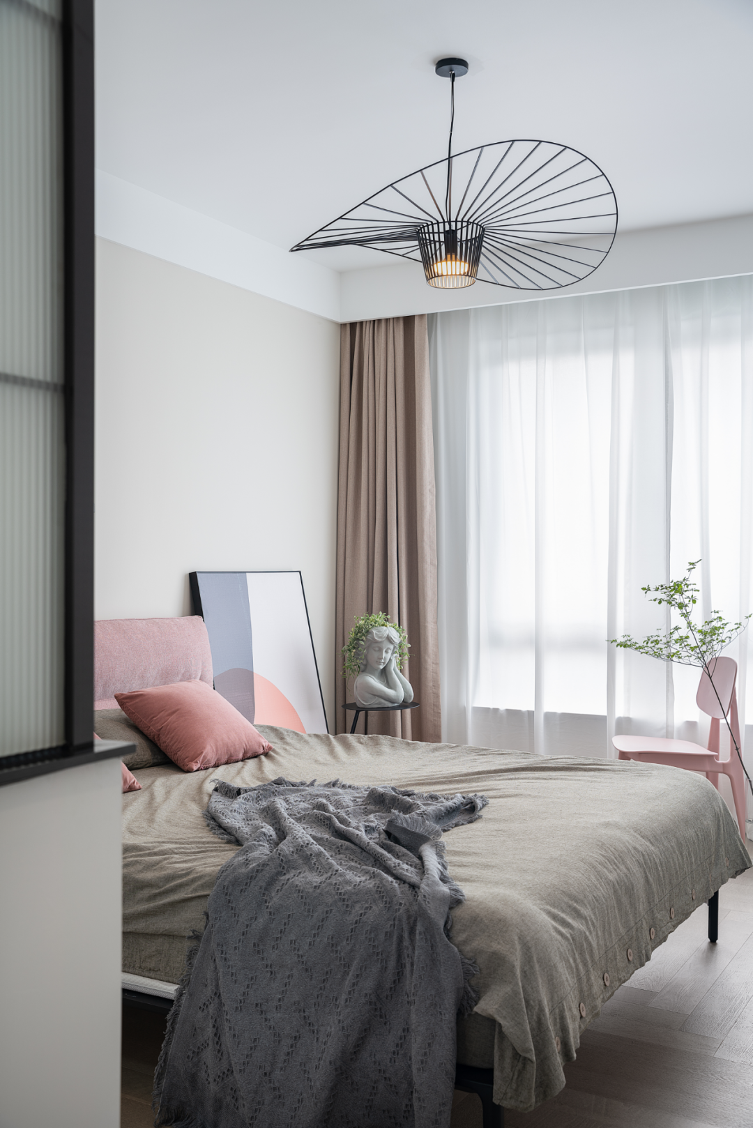 主臥以低飽和度的灰色調(diào)為主,營造靜謐浪漫氣息。